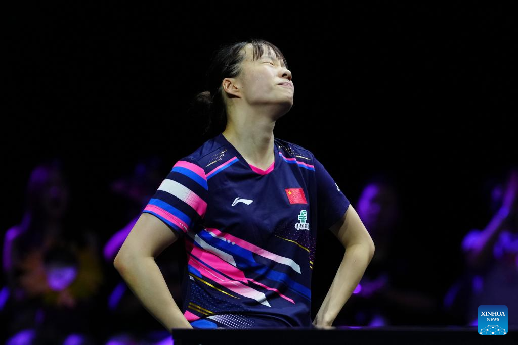 Shi Xunyao of China reacts during the women's singles semifinal match between Sun Yingsha of China and Shi Xunyao of China at the WTT Champions Yokohama 2025 in Yokohama, Japan, Aug. 11, 2025. (Xinhua/Jia Haocheng)