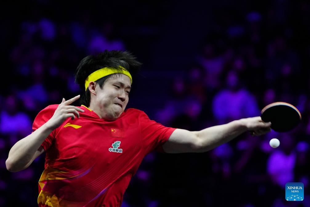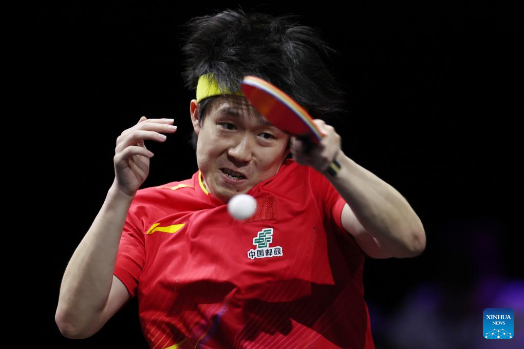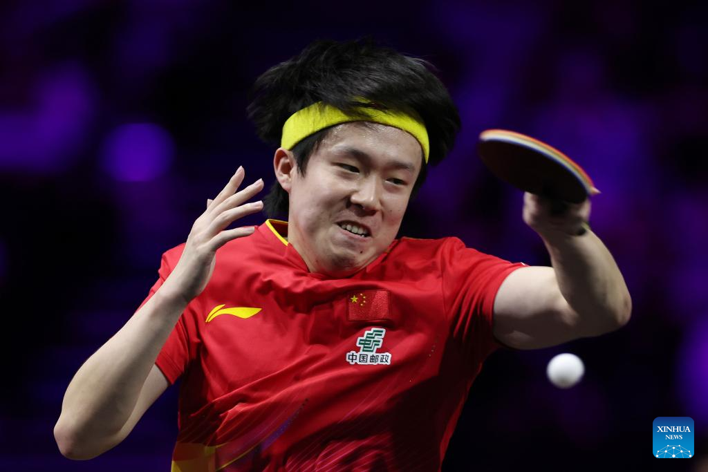 Wang Chuqin of China hits a return during the men's singles semifinal match between Wang Chuqin of China and Truls Moregard of Sweden at the WTT Champions Yokohama 2025 in Yokohama, Japan, Aug. 11, 2025. (Xinhua/Jia Haocheng)