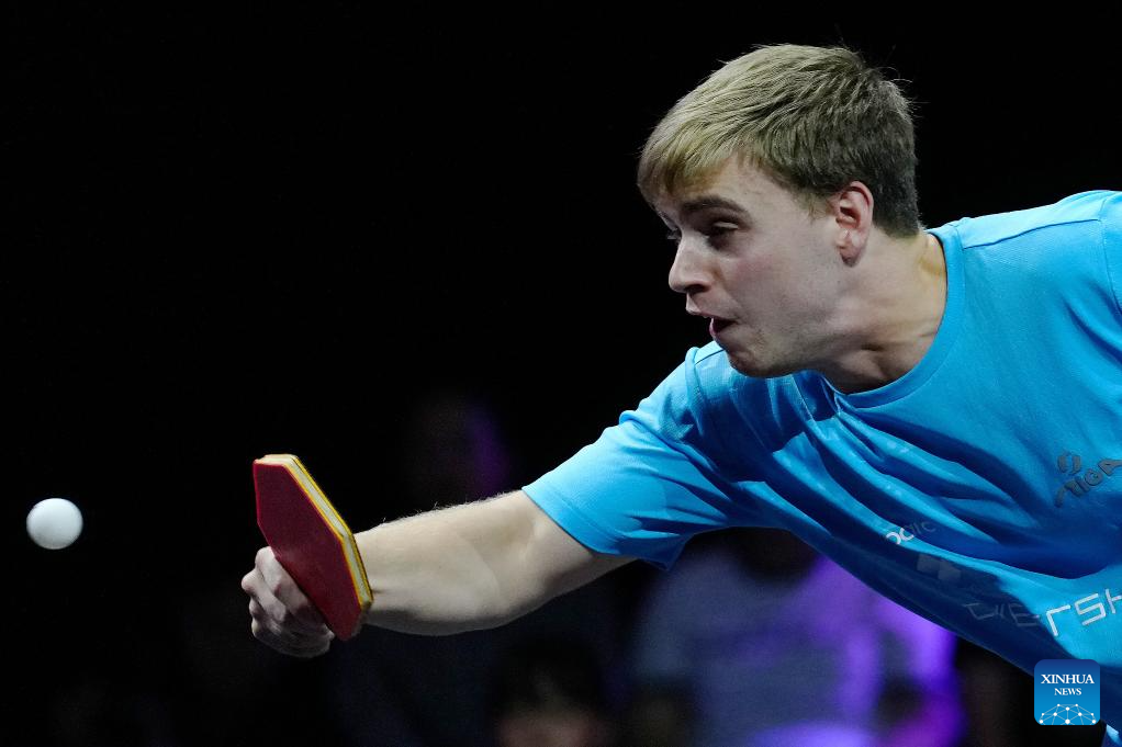Truls Moregard of Sweden hits a return during the men's singles semifinal match between Wang Chuqin of China and Truls Moregard of Sweden at the WTT Champions Yokohama 2025 in Yokohama, Japan, Aug. 11, 2025. (Xinhua/Jia Haocheng)