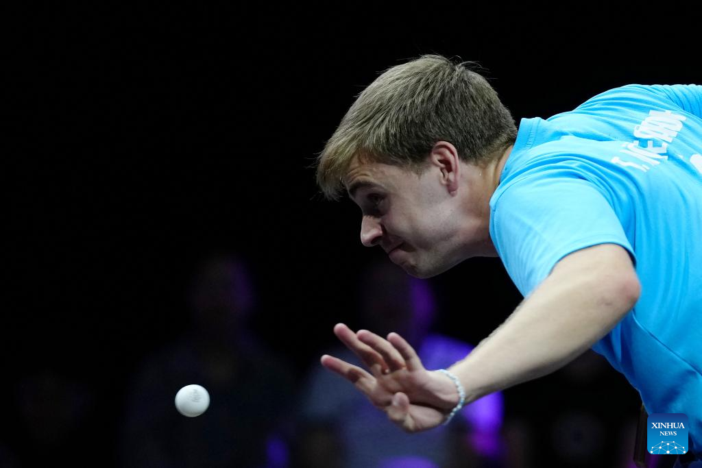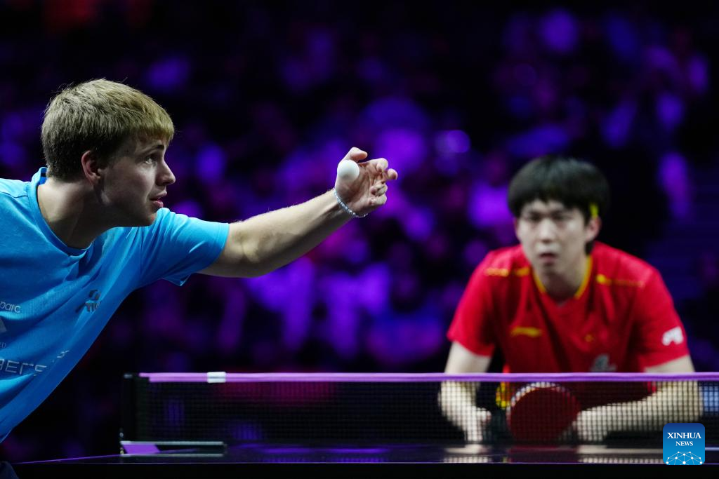 Truls Moregard (L) of Sweden serves during the men's singles semifinal match between Wang Chuqin of China and Truls Moregard of Sweden at the WTT Champions Yokohama 2025 in Yokohama, Japan, Aug. 11, 2025. (Xinhua/Jia Haocheng)
