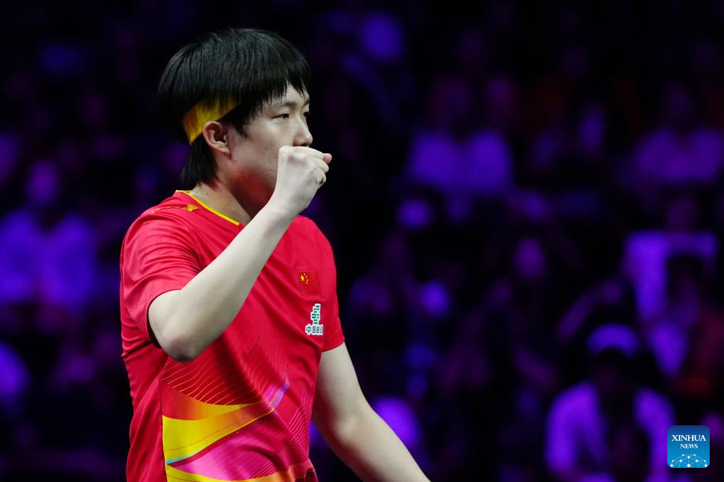 Wang Chuqin of China celebrates scoring during the men's singles semifinal match between Wang Chuqin of China and Truls Moregard of Sweden at the WTT Champions Yokohama 2025 in Yokohama, Japan, Aug. 11, 2025. (Xinhua/Jia Haocheng)