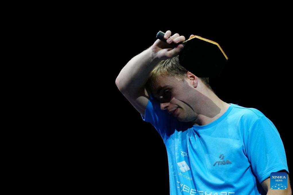 Truls Moregard of Sweden reacts during the men's singles semifinal match between Wang Chuqin of China and Truls Moregard of Sweden at the WTT Champions Yokohama 2025 in Yokohama, Japan, Aug. 11, 2025. (Xinhua/Jia Haocheng)