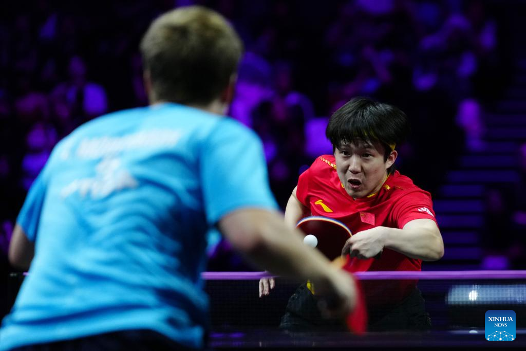 Wang Chuqin (R) of China hits a return during the men's singles semifinal match between Wang Chuqin of China and Truls Moregard of Sweden at the WTT Champions Yokohama 2025 in Yokohama, Japan, Aug. 11, 2025. (Xinhua/Jia Haocheng)