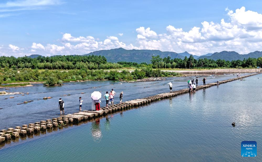 A drone photo taken on Aug. 11, 2025 shows tourists having fun along a river in Xianju County of Taizhou, east China's Zhejiang Province. Scenic areas across China have entered peak season for tourism during summer vacation. (Photo by Wang Huabin/Xinhua)