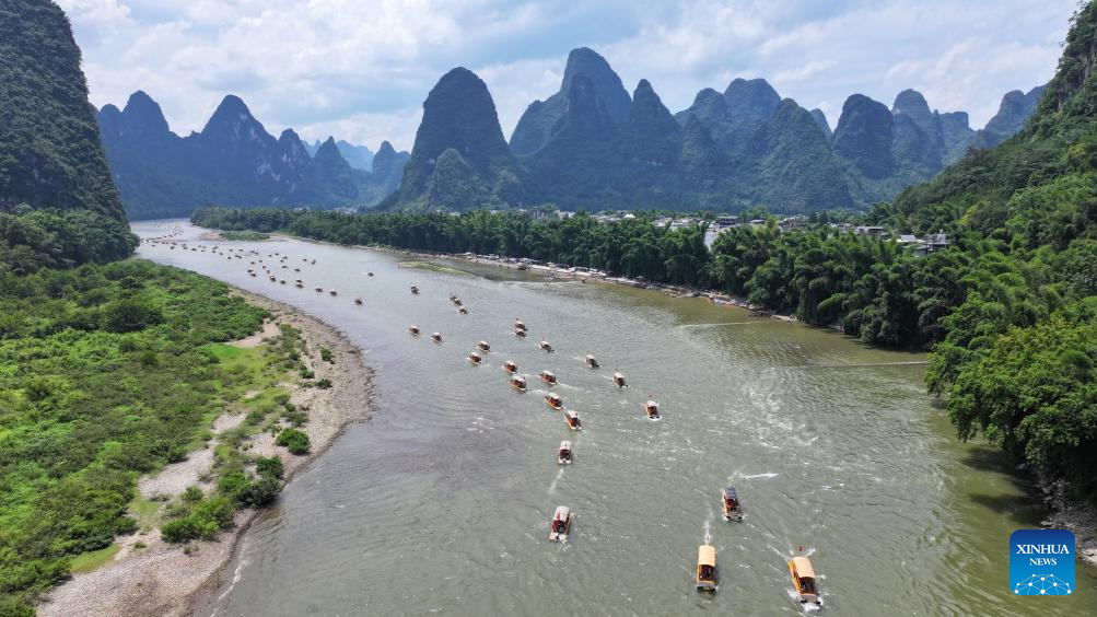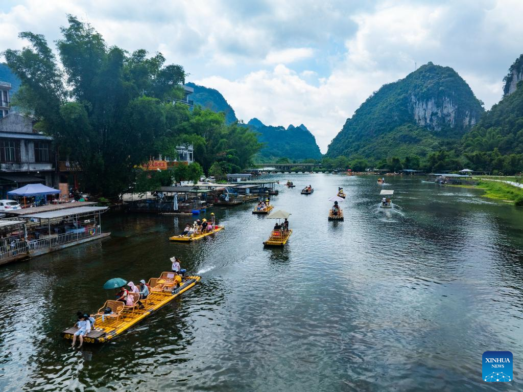 An aerial drone photo taken on Aug. 10, 2025 shows tourists enjoying the scenery on bamboo rafts along the Lijiang river in Yangshuo County, south China's Guangxi Zhuang Autonomous Region. Scenic areas across China have entered peak season for tourism during summer vacation. (Photo by He Hongfu/Xinhua)