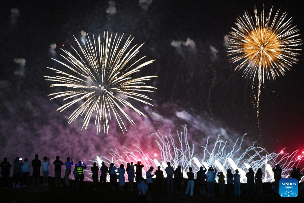 Tourists watch a firework show in Shapotou District of Zhongwei, northwest China's Ningxia Hui Autonomous Region, on Aug. 10, 2025. Scenic areas across China have entered peak season for tourism during summer vacation. (Photo by Yuan Hongyan/Xinhua)