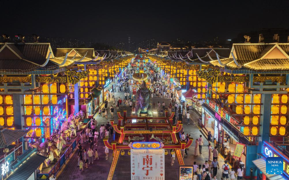 A drone photo taken on Aug. 9, 2025 shows tourists visiting a night market in Nanning, south China's Guangxi Zhuang Autonomous Region. Scenic areas across China have entered peak season for tourism during summer vacation. (Photo by Jiang Keqing/Xinhua)
