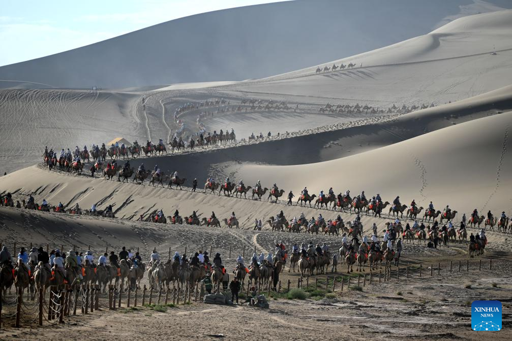 Tourists visit the Mingsha Mountain and Crescent Spring scenic spot in Dunhuang City, northwest China's Gansu Province, on Aug. 9, 2025. Scenic areas across China have entered peak season for tourism during summer vacation. (Photo by Zhang Xiaoliang/Xinhua)