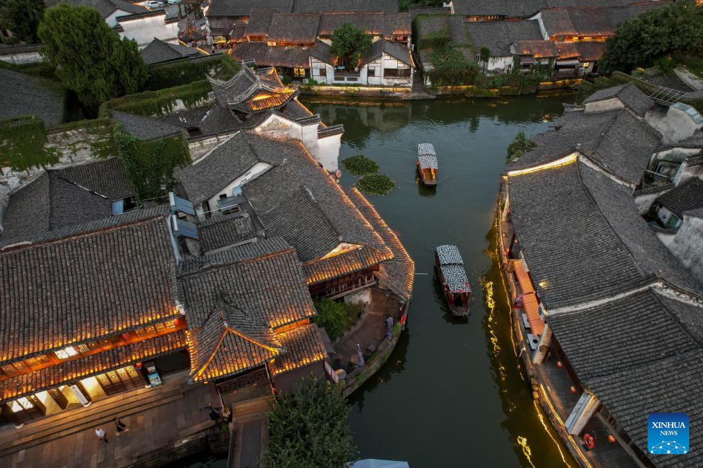 An aerial drone photo taken on Aug. 9, 2025 shows a night view of Xinshi ancient town in Deqing County, east China's Zhejiang Province. Scenic areas across China have entered peak season for tourism during summer vacation. (Photo by Yao Haixiang/Xinhua)