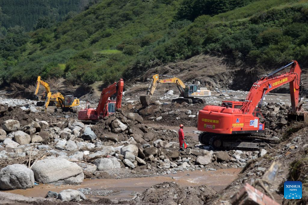 Rescuers carry out search operations in Yangwashan Village, Yuzhong County of northwest China's Gansu Province, Aug. 11, 2025. Roads damaged by mountain torrents in Yuzhong County reopened on Sunday and power supply has been restored following the disaster that left 13 dead and 30 missing. (Xinhua/Fan Peishen)