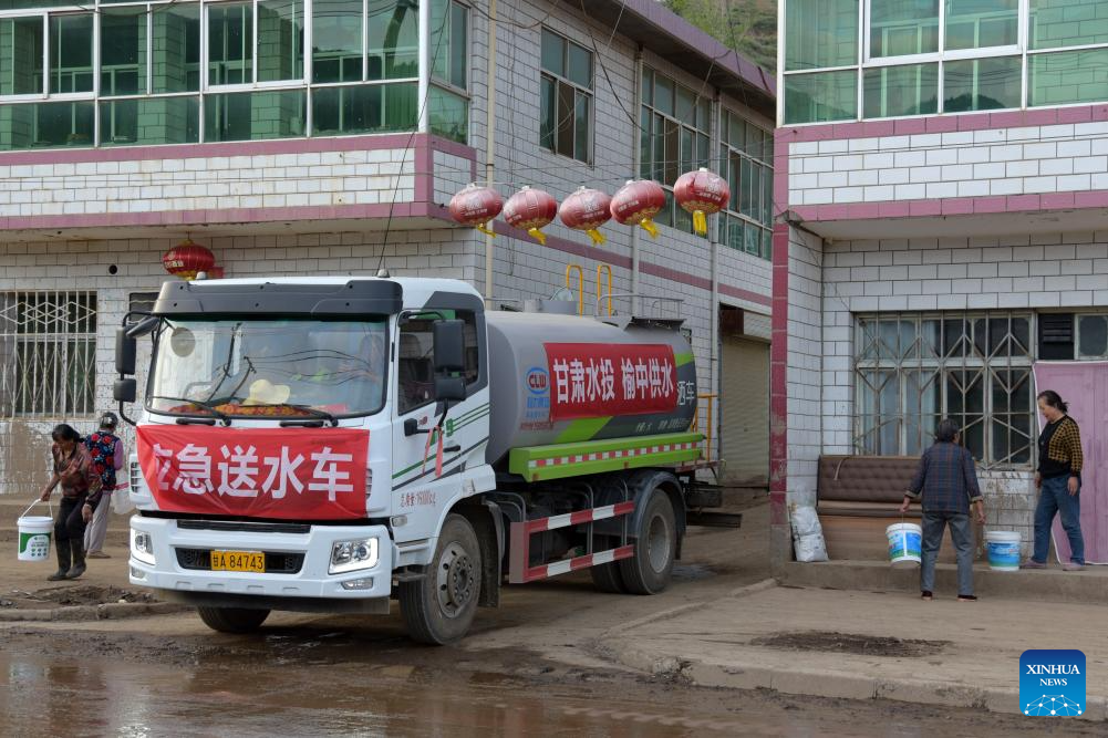 A worker of the water resources department delivers drinking water to villagers in Xinglongshan Village, Yuzhong County of northwest China's Gansu Province, Aug. 11, 2025. Roads damaged by mountain torrents in Yuzhong County reopened on Sunday and power supply has been restored following the disaster that left 13 dead and 30 missing. (Xinhua/Fan Peishen)