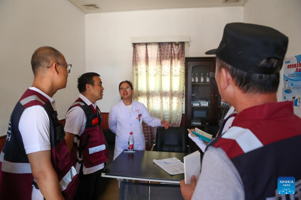 Disease control personnel and medical workers discuss environmental disinfection measures at a medical service point in Shangzhuang Village, Yuzhong County of northwest China's Gansu Province, Aug. 11, 2025. Roads damaged by mountain torrents in Yuzhong County reopened on Sunday and power supply has been restored following the disaster that left 13 dead and 30 missing. (Xinhua/Lang Bingbing)