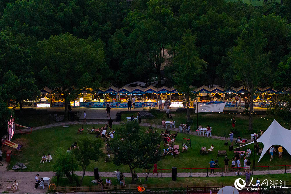 On Aug. 10, locals watch movies on the lawn and stroll around the night fair in the ancient Cicheng town, Jiangbei district of Ningbo city, east China's Zhejiang Province. (People's Daily Online/Zhang Yongtao)