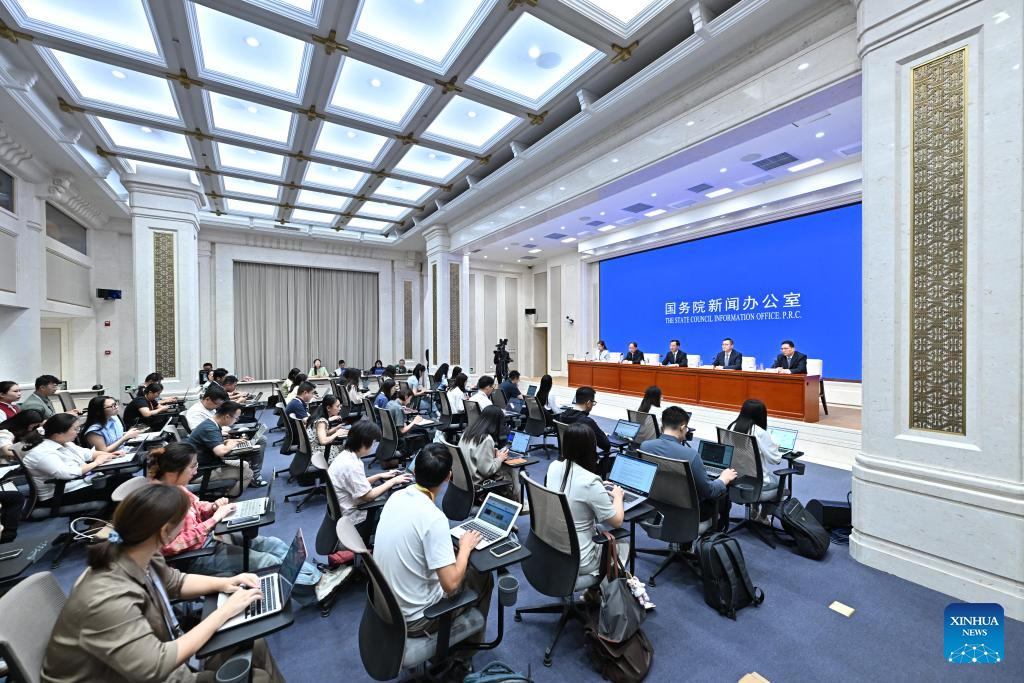 Liu Liehong, a member of the Communist Party of China Leadership Group of the National Development and Reform Commission and head of the National Data Administration (NDA), speaks during a press conference held by the State Council Information Office (SCIO) on achievements in Digital China development during the 14th Five-Year Plan period (2021-2025) in Beijing, capital of China, Aug. 14, 2025. Liu and NDA deputy heads Shen Zhulin, Chen Ronghui and Xia Bing attended the press conference in Beijing on Thursday. (Xinhua/Li Xin)
