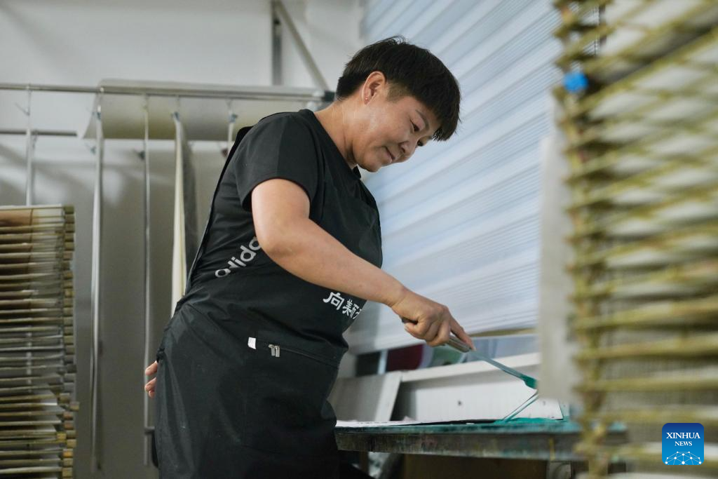 Painter Shi Fangyu creates a Jarud woodblock painting at a woodblock painting institute in Jarud Banner, north China's Inner Mongolia Autonomous Region, Aug. 10, 2025. (Xinhua/Lian Zhen)