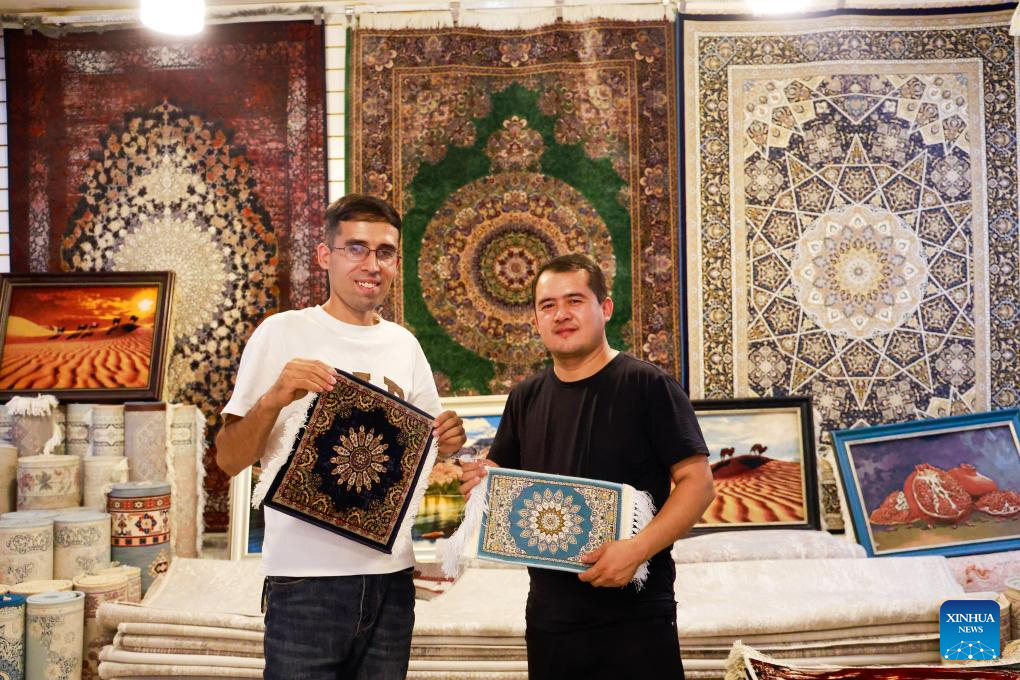 Visitors select rugs at a carpet store in Tuancheng of Hotan City, northwest China's Xinjiang Uygur Autonomous Region, Aug. 14, 2025. Tuancheng, which means the town of unity, is a typical traditional neighborhood in south Xinjiang.