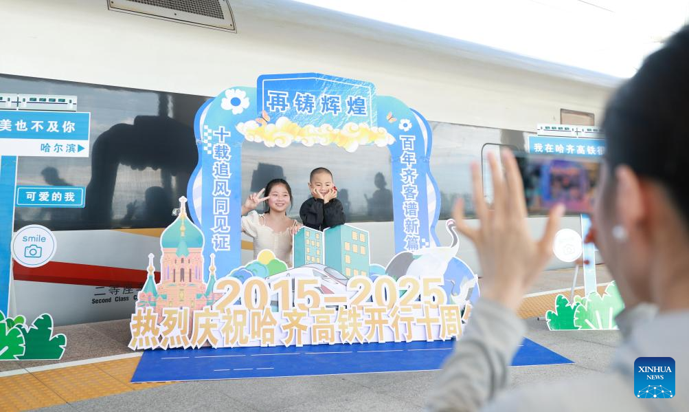 Children pose for photos at Qiqihar South Railway Station in Qiqihar, northeast China's Heilongjiang Province, Aug. 17, 2025. On Aug. 17, 2015, the Harbin-Qiqihar railway, Heilongjiang's first high-speed railway, from the provincial capital Harbin to Qiqihar City, was put into operation and became China's northernmost of its kind in operation in the northeastern province of China.