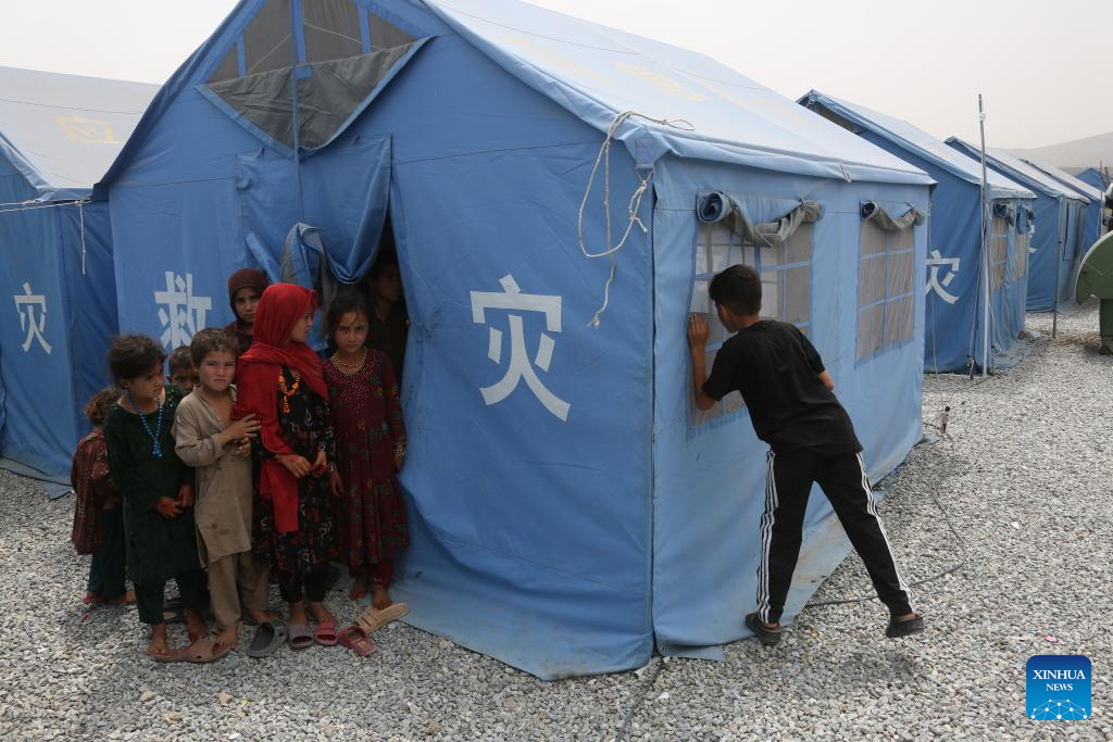 Afghan children stand outside a China-donated tent at a temporary refugee camp in Kabul, Afghanistan, on Aug. 17, 2025. Across Afghanistan, stories of returnees and students alike paint a picture of resilience and renewal -- a process strengthened by China's timely humanitarian aid and far-reaching educational cooperation. (Photo by Saifurahman Safi/Xinhua)