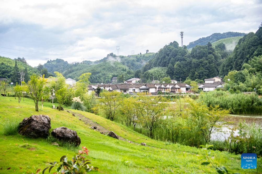 This photo taken on Aug. 15, 2025 shows a view of Lieshen Village in Zhushan Town, Liangping District of southwest China's Chongqing Municipality, Aug. 15, 2025. Lieshen Village, home to more than 8,000 mu (533 hectares) of forest, has actively transformed the obsolete mining zone there into environment-friendly businesses such as homestays, healthcare facilities and camping sites in pursuit of green development. (Xinhua/Tang Yi)