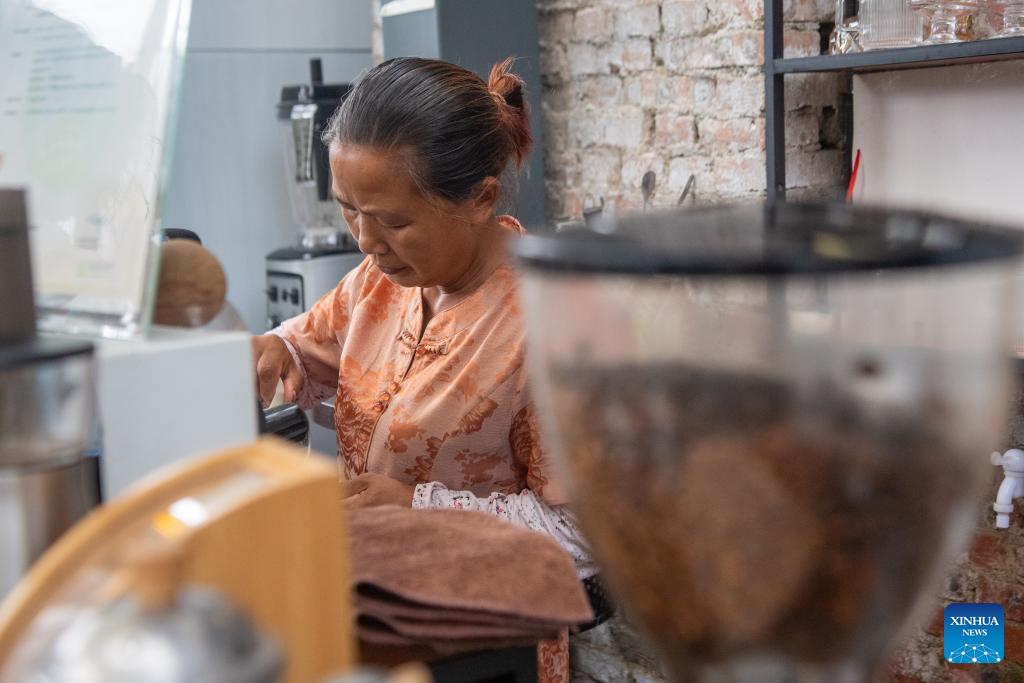 A staff member brews coffee at a cafe converted from a mining site at Lieshen Village in Zhushan Town, Liangping District of southwest China's Chongqing Municipality, Aug. 15, 2025. Lieshen Village, home to more than 8,000 mu (533 hectares) of forest, has actively transformed the obsolete mining zone there into environment-friendly businesses such as homestays, healthcare facilities and camping sites in pursuit of green development. (Xinhua/Tang Yi)