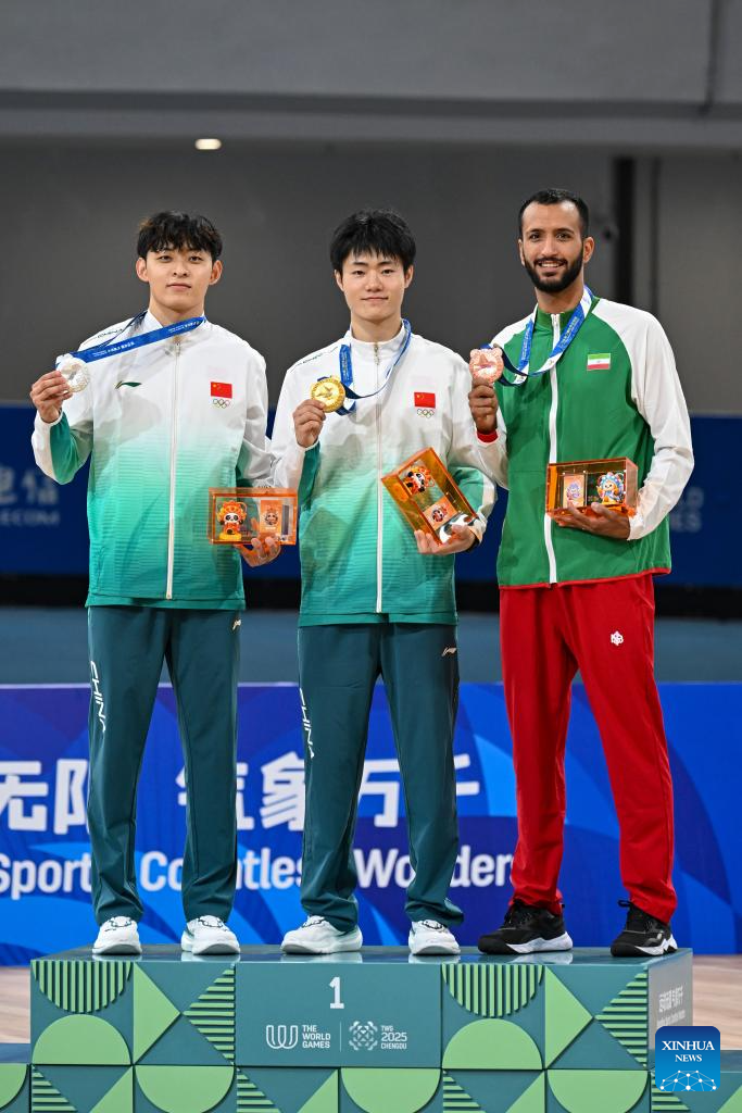 Gold medalist Zhang Hao (C) of China, silver medalist Fu Yu (L) of China and bronze medalist Reza Lesani of Iran pose during the victory ceremony for the Men's Speed Slalom event of Inline Freestyle Skating event at The World Games 2025 in Chengdu, southwest China's Sichuan Province, Aug. 16, 2025. (Xinhua/Xie Jianfei)