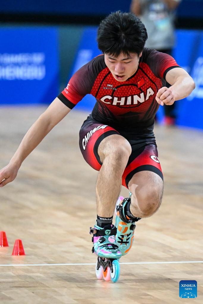 Fu Yu of China competes during the Men's Speed Slalom Gold Medal Final against Zhang Hao of China of Inline Freestyle Skating event at The World Games 2025 in Chengdu, southwest China's Sichuan Province, Aug. 16, 2025. (Xinhua/Xie Jianfei)