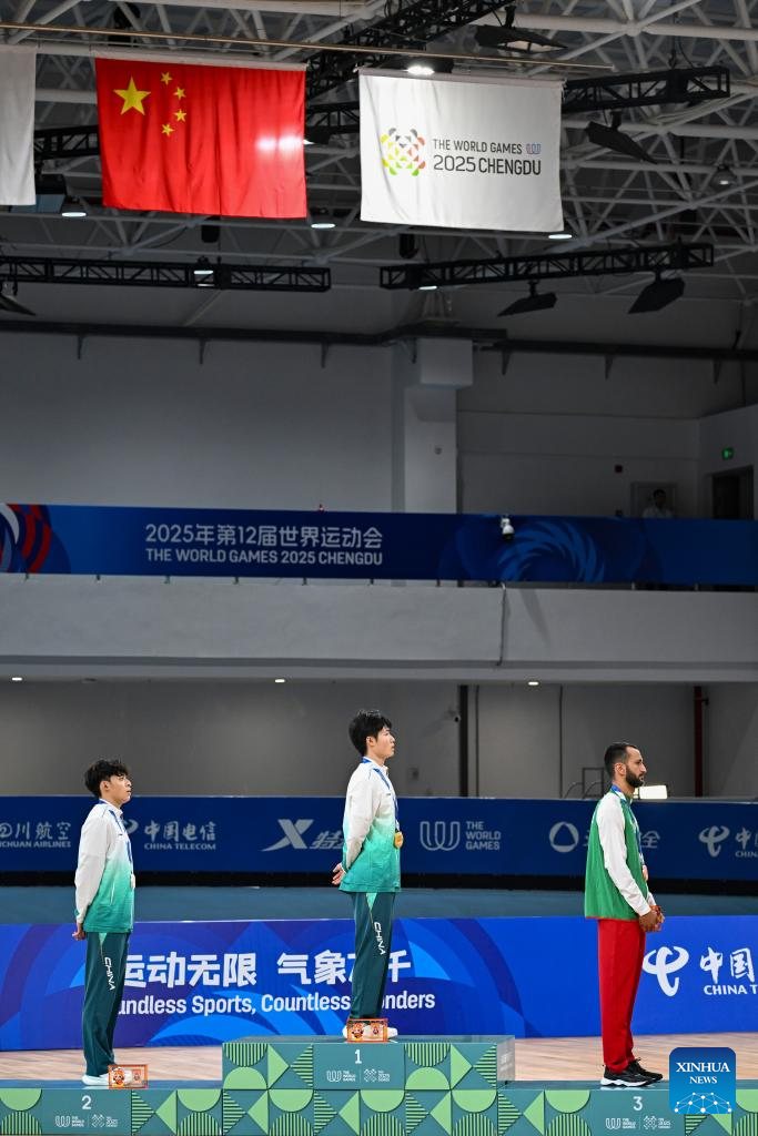 Gold medalist Zhang Hao of China pose during the victory ceremony for the Men's Speed Slalom event of Inline Freestyle Skating event at The World Games 2025 in Chengdu, southwest China's Sichuan Province, Aug. 16, 2025. (Xinhua/Xie Jianfei)