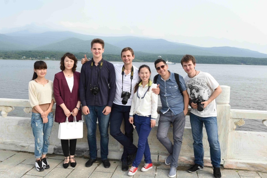 Photography enthusiasts from Khabarovsk, Russia, pose for a group photo during an exhibition tour in Fuyuan, a county-level city administered by Jiamusi, northeast China's Heilongjiang province. (Photo/Wang Lin)