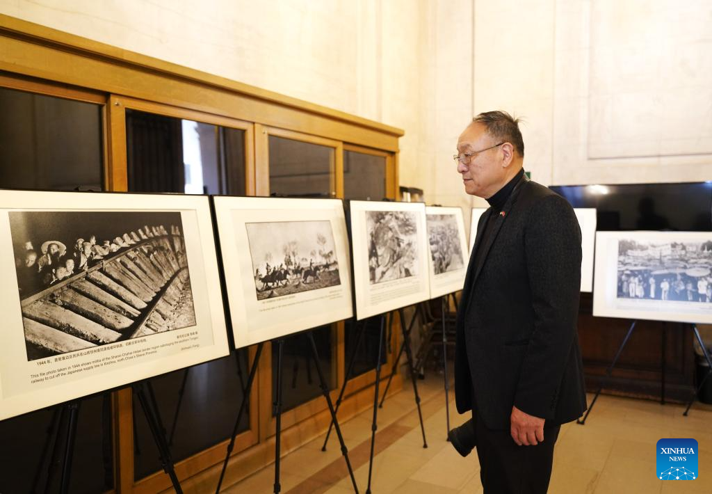 A guest watches photos during a photo exhibition commemorating the 80th anniversary of the victory of the Chinese People's War of Resistance Against Japanese Aggression and the World Anti-Fascist War at Herbst Theatre in San Francisco, the United States, Aug. 17, 2025. (Xinhua/Wu Xiaoling)