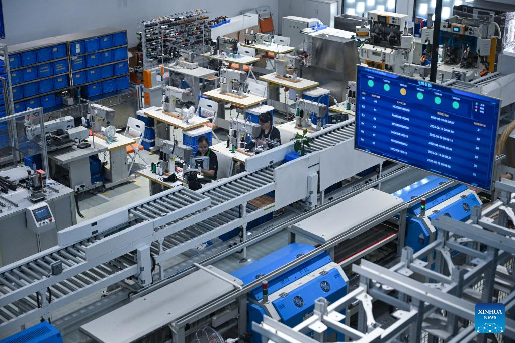 Workers work at the smart workshop of a footwear company in Putian, southeast China's Fujian Province, Aug. 19, 2025. At a custom-made factory in Putian, an equipment is recording a consumer' foot measurements to create personalized designs based on the consumer's preferences. The intelligent production line can then manufacture a pair of new shoes in just over an hour.