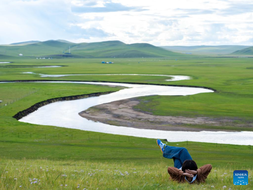 A tourist rests on the grass near the Mergel Gol River in Hulun Buir, north China's Inner Mongolia Autonomous Region on Aug. 19, 2025. (Xinhua/Ma Jinrui)