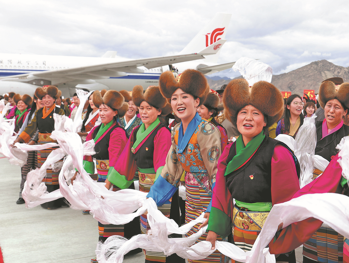 President Xi and the central delegation are welcomed by local people lining the streets of Lhasa and a cheering crowd at the airport on Wednesday. FENG YONGBIN/CHINA DAILY