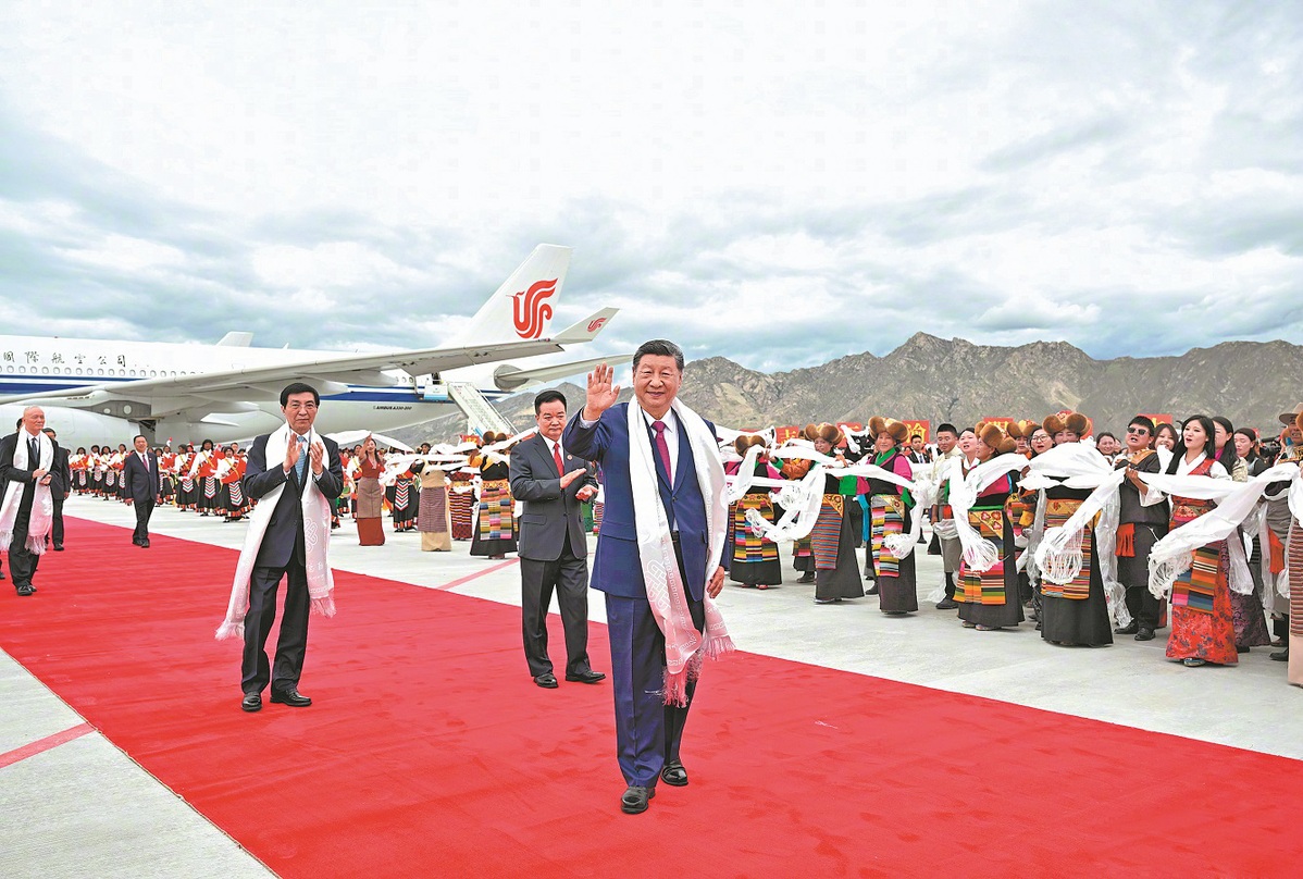 President Xi Jinping, who is also general secretary of the Communist Party of China Central Committee and chairman of the Central Military Commission, waves to waiting crowds after arriving on Wednesday at Lhasa, the Xizang autonomous region, ahead of a grand gathering on Thursday to celebrate the region's 60th founding anniversary. XINHUA