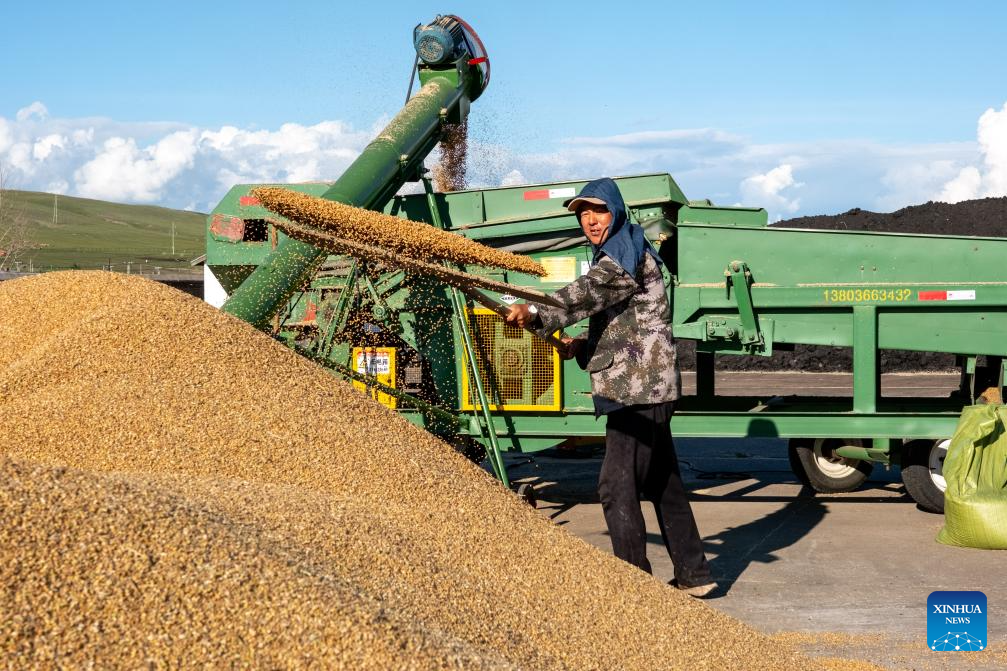 A farmer sorts newly-harvested wheat at a farm in Ergun of Hulun Buir, north China's Inner Mongolia Autonomous Region, Aug. 20, 2025. Wheat here has entered harvest season recently. (Xinhua/Ma Jinrui)