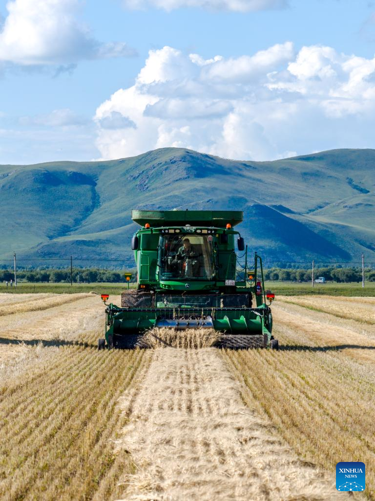 A farmer drives a tractor to dry wheat at a farm in Ergun of Hulun Buir, north China's Inner Mongolia Autonomous Region, Aug. 20, 2025. Wheat here has entered harvest season recently. (Xinhua/Ma Jinrui)