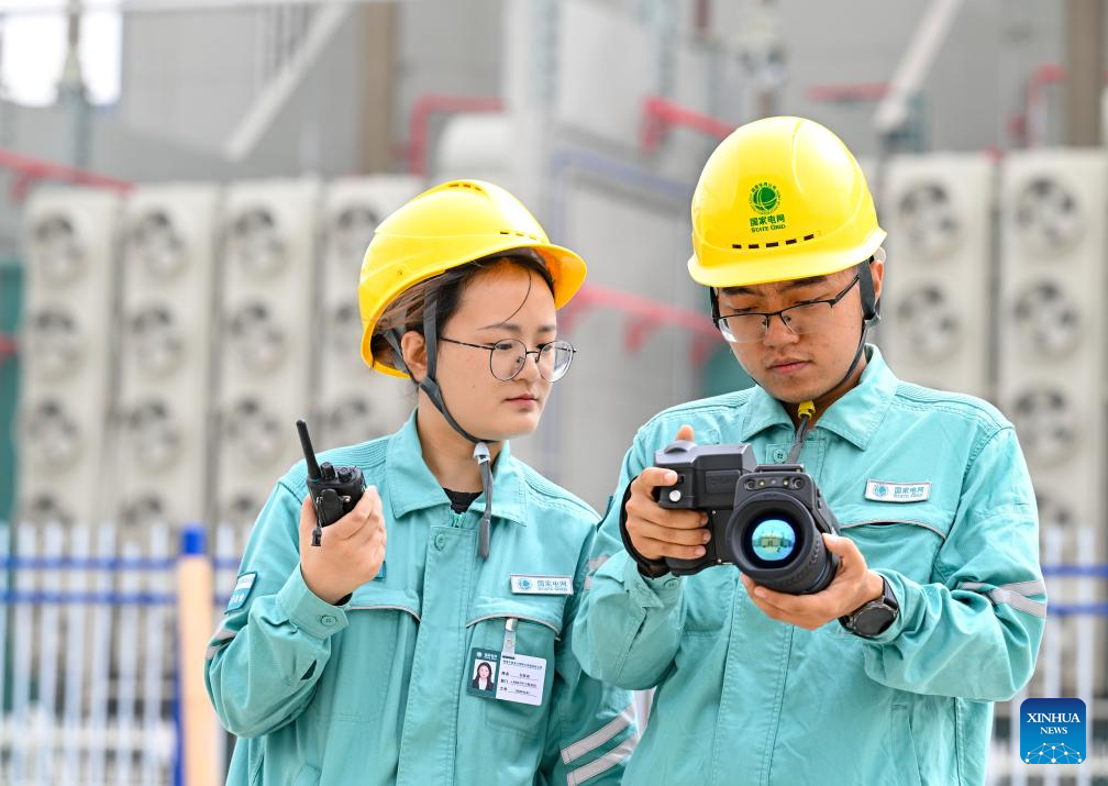 Operation and maintenance personnel perform infrared temperature measurement of the lines that have been put into operation at the Zhongning converter station, the sending end of the Ningxia-Hunan ±800 kV ultra-high voltage (UHV) direct current transmission project in Zhongwei City, northwest China's Ningxia Hui Autonomous Region, Aug. 20, 2025. The Ningxia-Hunan ±800 kV UHV direct current transmission project, which brings electricity from northwest China's Ningxia Hui Autonomous Region to central China's Hunan Province, was put into operation for power transmission on Wednesday.