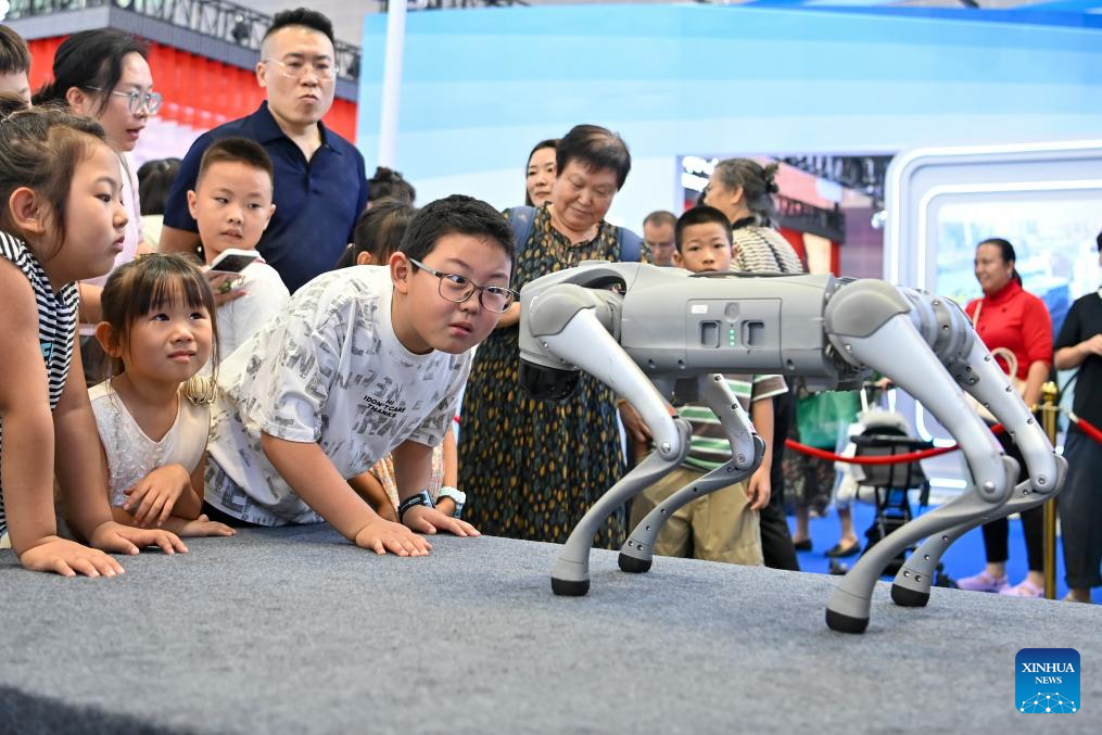 Children interact with a robot dog at the 7th Shanxi Cultural Industries Fair in Taiyuan, north China's Shanxi Province, Aug. 21, 2025. The fair kicked off here on Thursday and will last till Aug. 25, attracting about 2,000 exhibitors from over 30 countries and regions worldwide. (Xinhua/Yang Chenguang)
