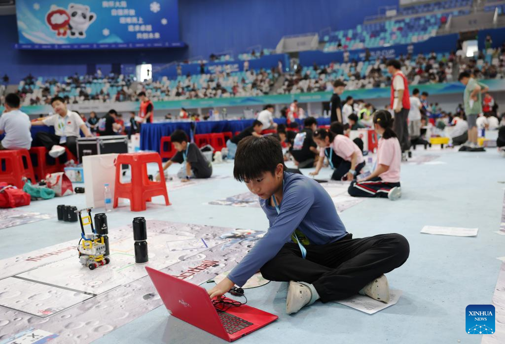 A participant competes during the 2025 Junior Botball Challenge Global Finals in China in Beijing, capital of China, Aug. 21, 2025. The 2025 Junior Botball Challenge Global Finals in China kicked off on Thursday at the National Speed Skating Oval in Beijing. Nearly 1,500 young science and technology enthusiasts from more than ten countries and regions, including China, the United States, Malaysia, Thailand, Austria, and Slovakia, participated in the event. (Xinhua/Zhang Chenlin)
