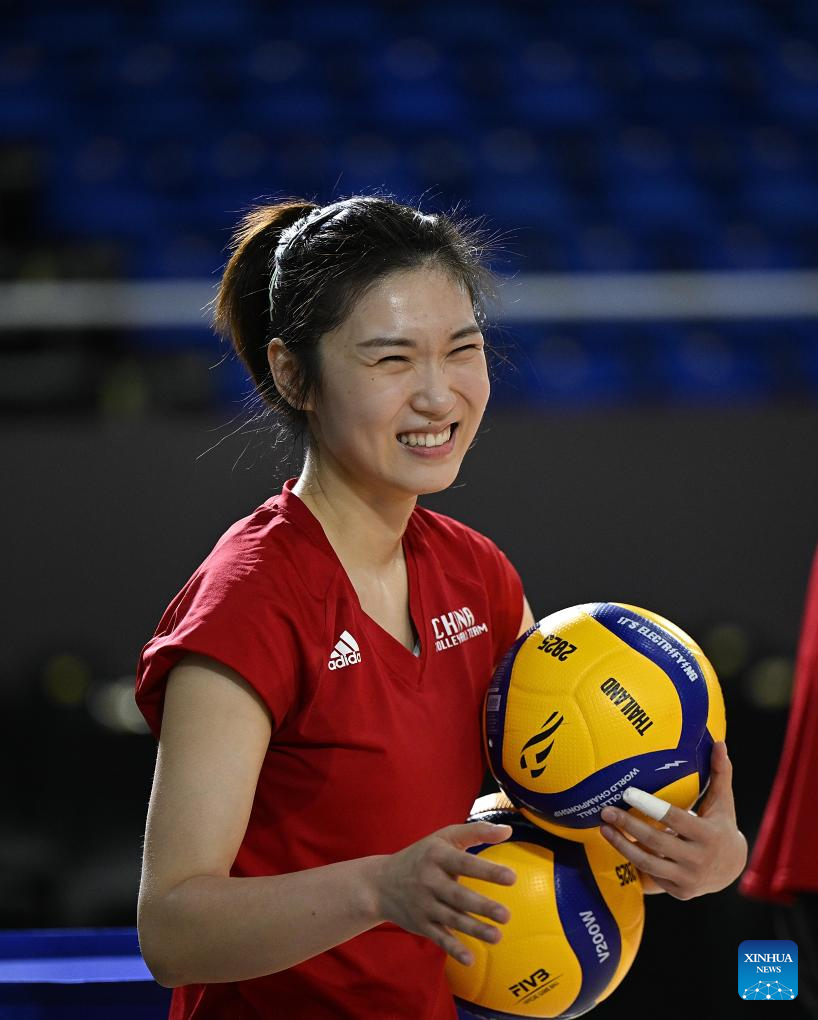 Li Yingying of team China takes part in a training session ahead of the FIVB Women's Volleyball World Championship in Chiang Mai, Thailand, Aug. 21, 2025. (Xinhua/Hou Zhaokang)