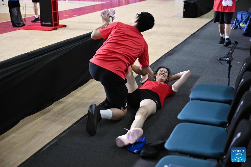 Wang Mengjie of team China reacts during a training session ahead of the FIVB Women's Volleyball World Championship in Chiang Mai, Thailand, Aug. 21, 2025. (Xinhua/Hou Zhaokang)