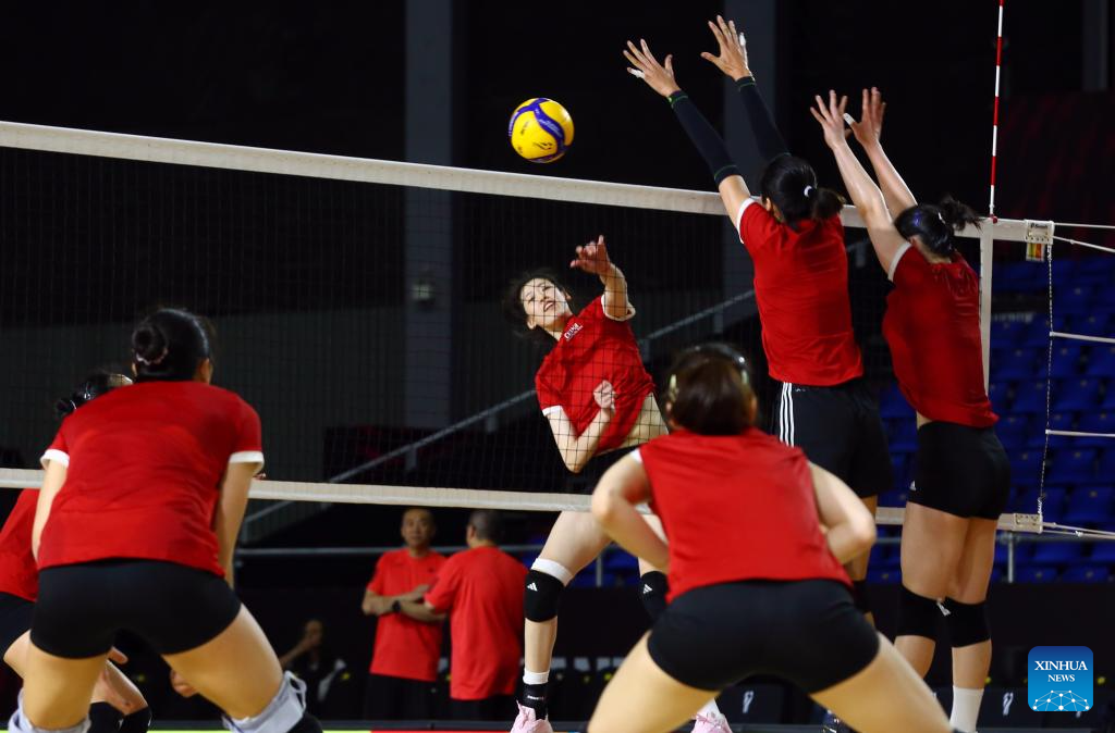 Players of team China take part in a training session ahead of the FIVB Women's Volleyball World Championship in Chiang Mai, Thailand, Aug. 21, 2025. (Xinhua/Sun Weitong)