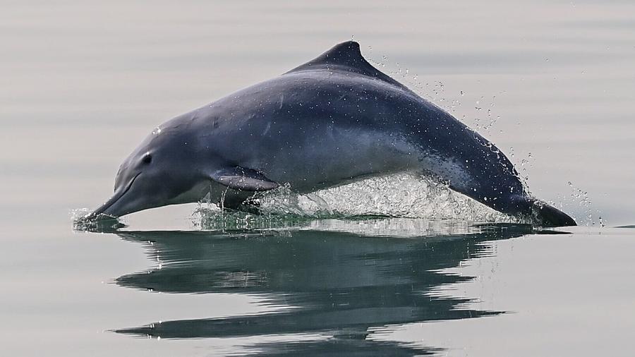 This photo taken on Jan. 6, 2025 shows a Chinese white dolphin calf bursting through the surface near Sanniang bay in Qinzhou City, south China's Guangxi Zhuang Autonomous Region. Sanniang Bay, located along the Beibu Gulf in the South China Sea, is dubbed the "hometown of Chinese white dolphins." (Xinhua/Zhang Ailin)