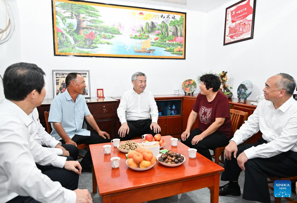 Li Xi, a member of the Standing Committee of the Political Bureau of the Communist Party of China (CPC) Central Committee and secretary of the CPC Central Commission for Discipline Inspection, visits Donggaozhuang Village of Sunzu Town, Yinan County, east China's Shandong Province, Aug. 20, 2025. Li made a research tour to Shandong from Wednesday to Friday. (Xinhua/Yue Yuewei)