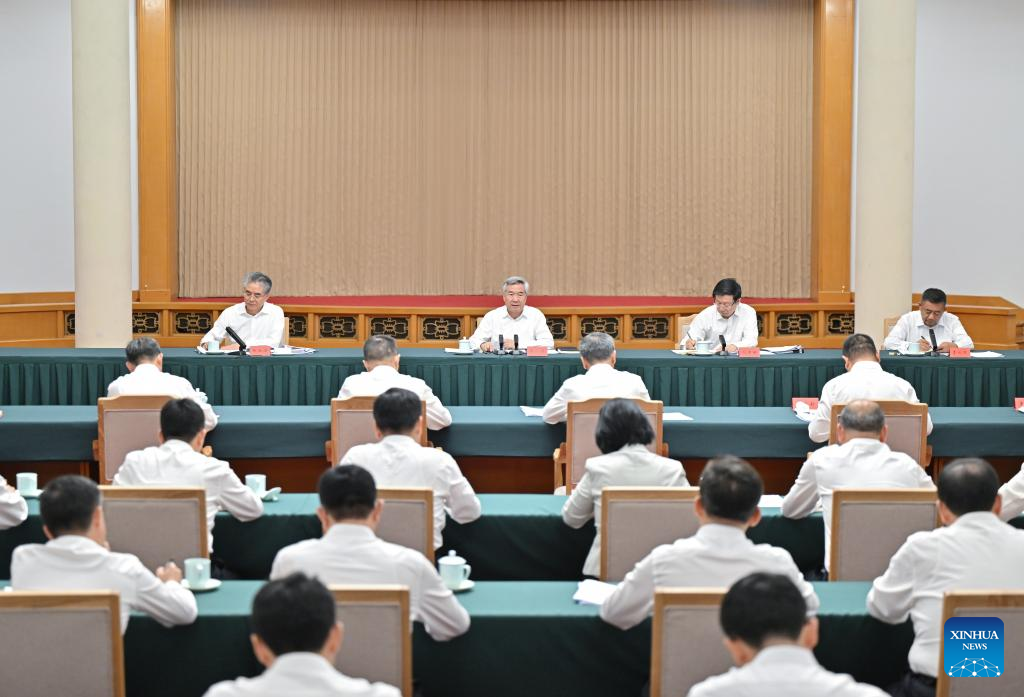 Li Xi, a member of the Standing Committee of the Political Bureau of the Communist Party of China (CPC) Central Committee and secretary of the CPC Central Commission for Discipline Inspection, presides over a symposium in Jinan, east China's Shandong Province, Aug. 22, 2025. Li made a research tour to Shandong from Wednesday to Friday. (Xinhua/Yue Yuewei)