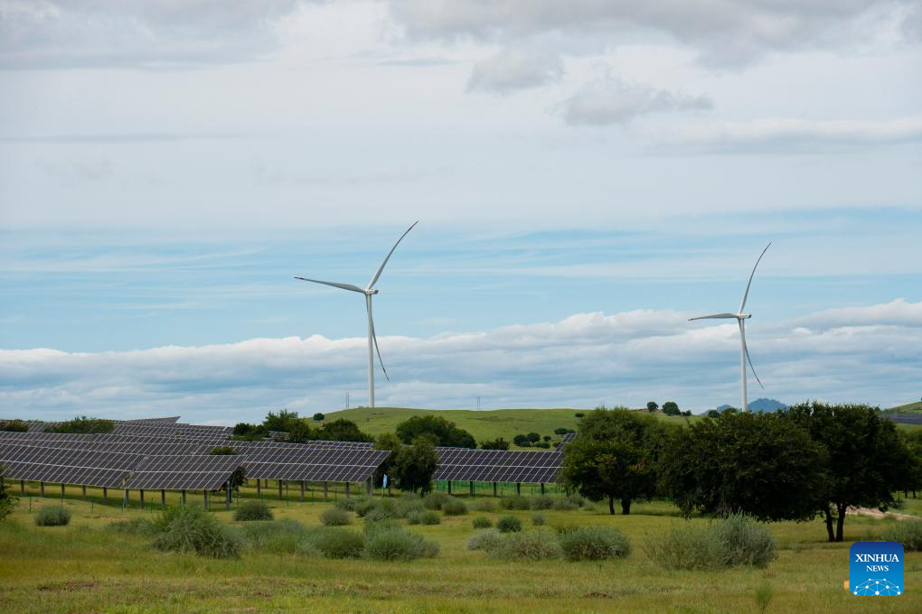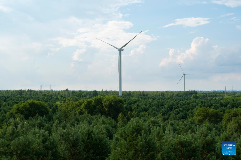 This photo taken on July 29, 2025 shows wind turbines and photovoltaic panels at the site of a desertification control project integrated with wind and solar power facilities in Horqin Right Wing Middle Banner of Hinggan League, north China's Inner Mongolia Autonomous Region. In recent years, Inner Mongolia has focused on the desertification control of the Horqin sandy land. The local authorities implemented projects integrating sand control and wind and solar power industries, establishing renewable energy facilities alongside afforestation and soil improvement efforts. (Xinhua/Ding He)