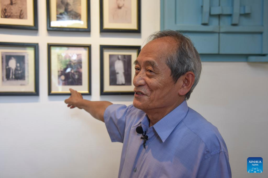 Lin Kuang-hui, a ninth-generation descendant of the Lin family and a founding member of the association for relatives of patriots in Taiwan who fought against Japanese occupation, speaks during an interview with Xinhua, at the Lin family's old mansion in Wufeng, Taichung City, southeast China's Taiwan, June 3, 2025.(Xinhua/Li Jianhua)