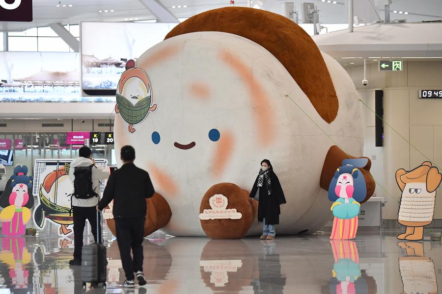A passenger poses for a photo with a giant sculpture of local snack "Roujiamo", or Chinese hamburger, at the departure hall of Terminal 5 of Xianyang International Airport in Xi'an, capital of northwest China's Shaanxi Province, Feb. 20, 2025. (Xinhua/Shao Rui)