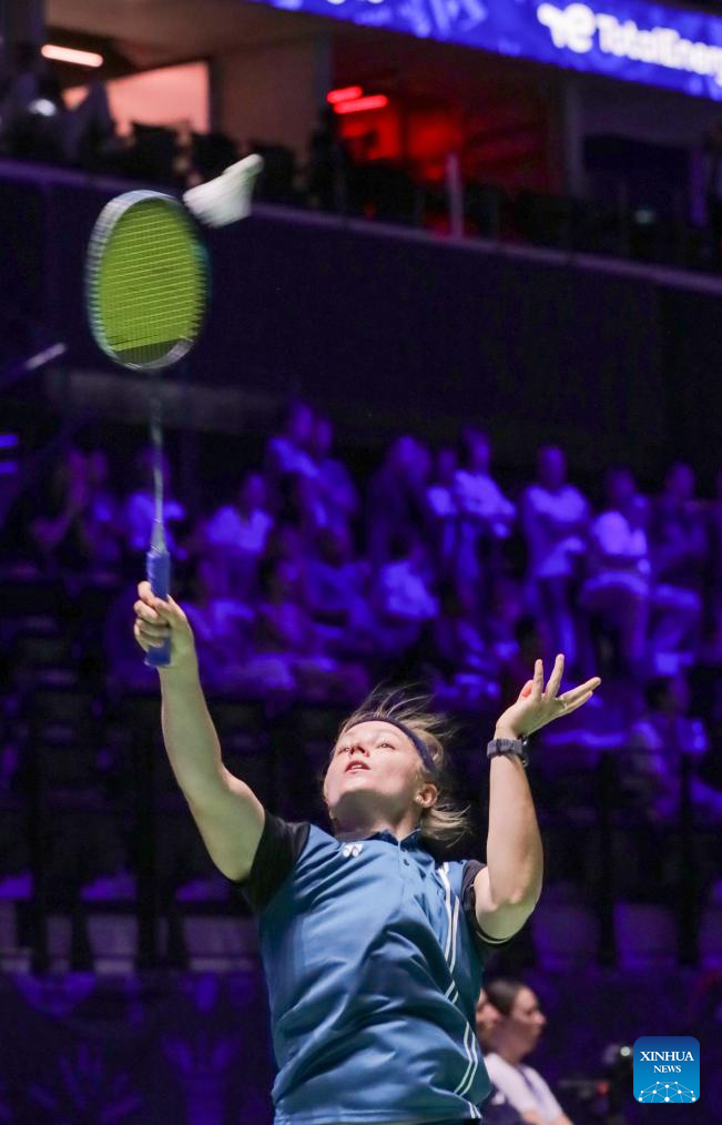 Agnes Korosi of Hungary hits a return during the women's singles first round match against Wang Zhiyi of China at the BWF World Championships 2025 in Paris, France, Aug. 26, 2025. (Xinhua/Zhang Fan)