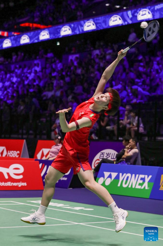 Wang Zhiyi of China hits a return during the women's singles first round match against Agnes Korosi of Hungary at the BWF World Championships 2025 in Paris, France, Aug. 26, 2025. (Xinhua/Zhang Fan)
