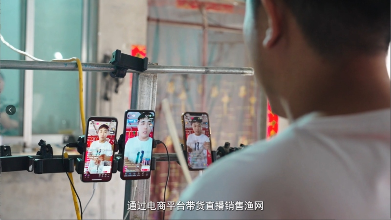A man sells fishing nets during a live-streaming session in Zhanhua district, Binzhou city, east China's Shandong Province. (Photo courtesy of the Publicity Department of the Communist Party of China Zhanhua District Committee)